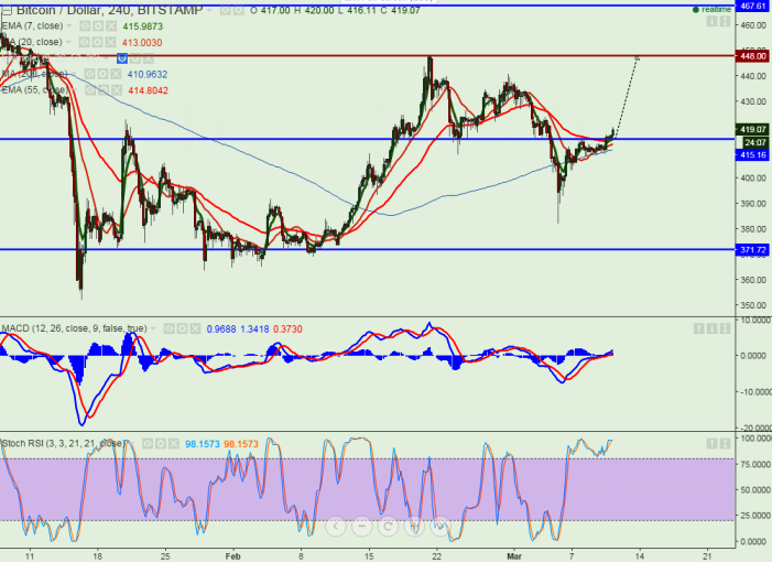 - BTC/USD has broken minor resistance $415 and jumped till $420 at the time of writing after making a low of $382. It is trading around $410.
