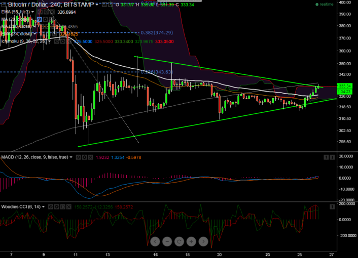 - The pair has broken minor trend line resistance $333 (trend line joining $356 and $350) but it should close above $336 (200 day 4 HMA) in 4 hour chart for further bullishness.