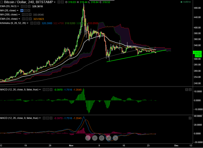 - BTC/USD has broken minor trend line support around $318 (trend line joining $294 and $310) and is currently trading around $318.