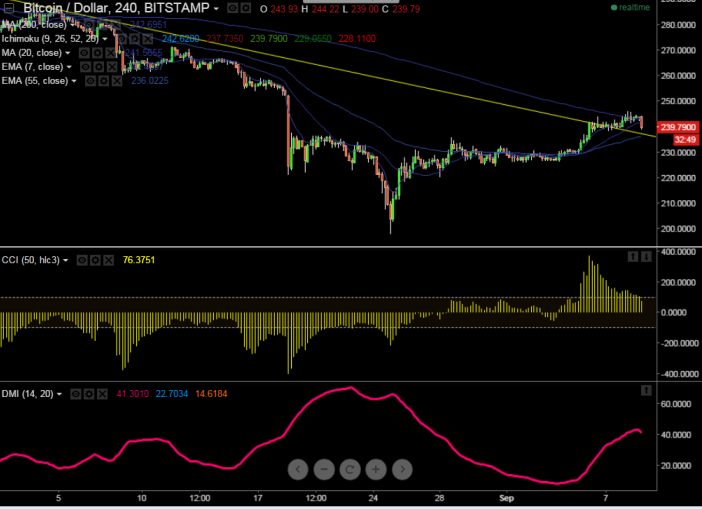 BTC/USD has recovered till $244 after making a low of $198 and is currently trading at $240. Short term trend is bullish as long as support $230 holds.