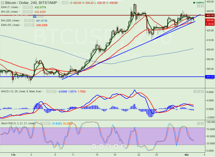 - BTC/USD has made a high of $440 and slightly retreated from that level. It is trading around $432.57.