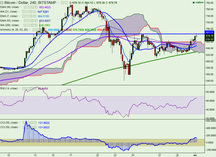 BTC/USD has recovered sharply after making a low of $628 yesterday. It is currently trading at $679 (BITSTAMP).