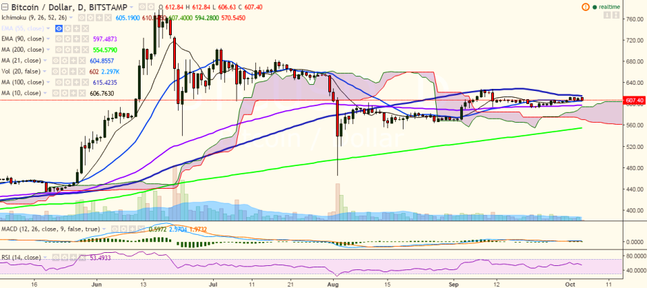 BTC/USD struggling to break above 100-day MA and is currently trading at 607 levels at the time of writing (Bitstamp).