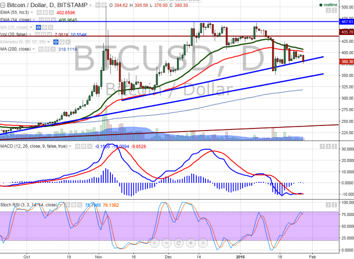 BTC/USD has made a low of $376 at the time of writing and slightly recovered from that level. It is currently trading around $380.