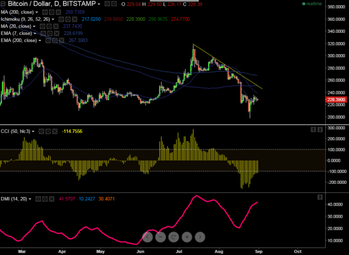 BTC/USD has recovered till $235 after making a low of $198 and is currently trading at $228. Short term trend is bullish as long as support $198 holds.