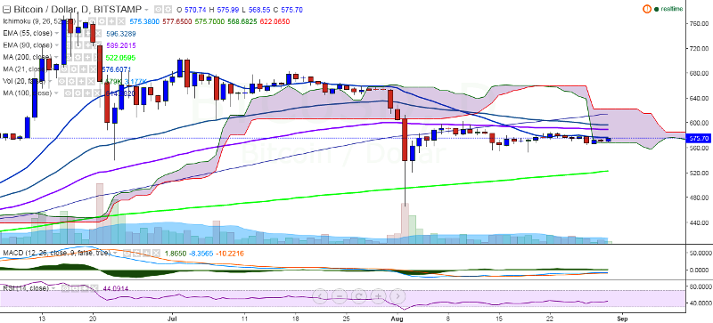 BTC/USD continues to trade below 21-day MA at 575.97 levels at the time of writing (Bitstamp).