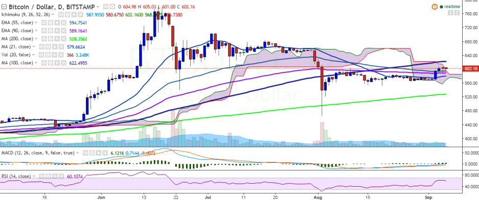 BTC/USD is showing a slight dip after hitting 609 levels and is currently trading at 602 levels at the time of writing (Bitstamp).