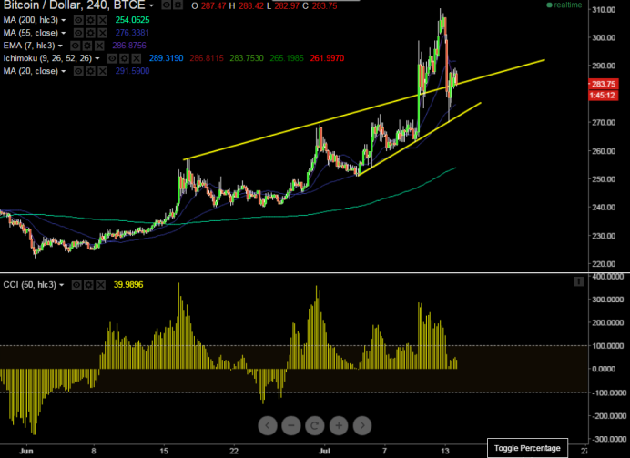 - BTC/USD has made a high of $310 and retreated from that level. Overall trend is weak as long as support $295 holds
