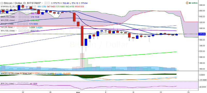 BTC/USD is hovering around 21-day MA and trading at 579.85 levels at the time of writing (Bitstamp). A close above this level would confirm minor bullishness in the pair.