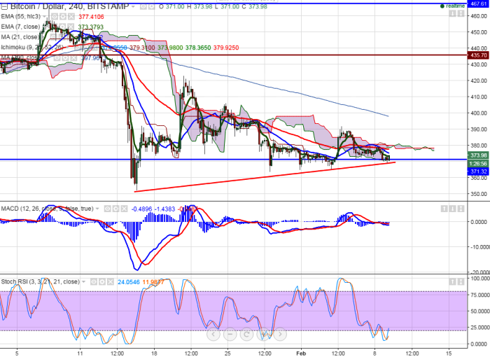 - BTC/USD is trading in narrow range between $369-$380. It is currently trading around $373. Short term trend is slightly bullish as long as support $350 holds.