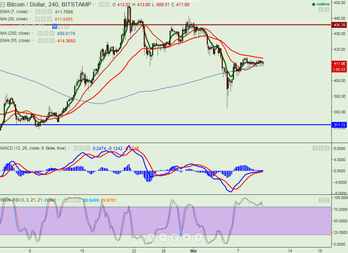 - BTC/USD has recovered till $415 after making a low of $382. It is trading around $410.