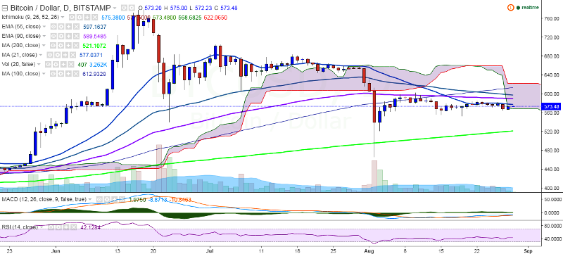 BTC/USD is trading weak, with its upside capped by 21-day MA. It is currently trading at 572.80 levels at the time of writing (Bitstamp).