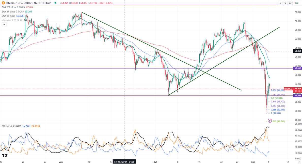 BTCUSD trades below the short-term moving average (21 and 55 EMA) and the long-term moving average (200 EMA) in the 4-hour chart.