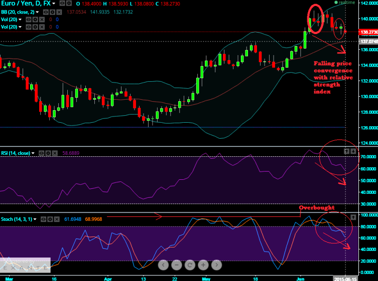 In addition to the above fundamental reasoning, on daily chart of EUR/JPY, back to back bearish candlestick patterns appeared on downswings to evidence short term downtrend. It is observed that formation of shooting star, spinning top & a hanging man appeared on peak of the uptrend to suggest reversal & a bit correction.