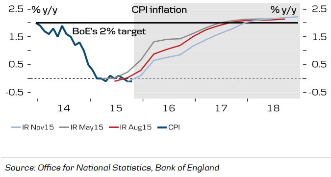 "As the hawkish BoE members have not been as hawkish as expected and since the oil price has lowered the inflation outlook, our call for a hike in Q1 16 has become very unlikely and thus we now expect the first BoE hike in Q2 16, probably in May 2016 in connection with the inflation Report (previously Q1 16, February 2016)", says Danske Bank in a research note.