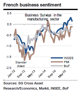 As the above chart shows, the indicator has enough scope to reach the PMIs and the reliable INSEE survey, and exceeding to 99 is likely to be possible (long-term average = 100).