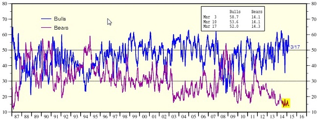 - Detailed position is explained in the chart, current percentage of bullish investors stands at 52% as of March 17, whereas bears stands at 14.3. Bullish investors have been reduced from 58.7 in March 3. However fall in S&P500 prior to FOMC, failed to attract the bears in market.