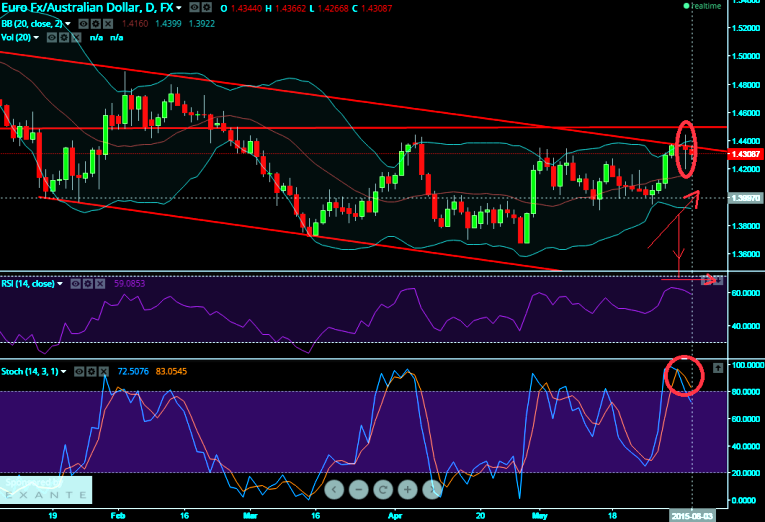 The pair was under control of bears to form a "spinning top candlestick" pattern on daily chart of EUR/AUD. The pair is actually puzzling on aggressive bears during the course of yesterday's whole session as there strong tug war between both bulls and bears.|