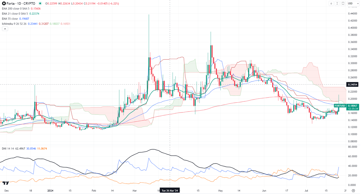 FORTUSD has gained more than 65% in the past two weeks. The pair holds above the short-term (21 and 55 EMA) and below the long-term moving average in the 4-hour chart. It hit a high of $0.2112 and is currently trading around $4.73.