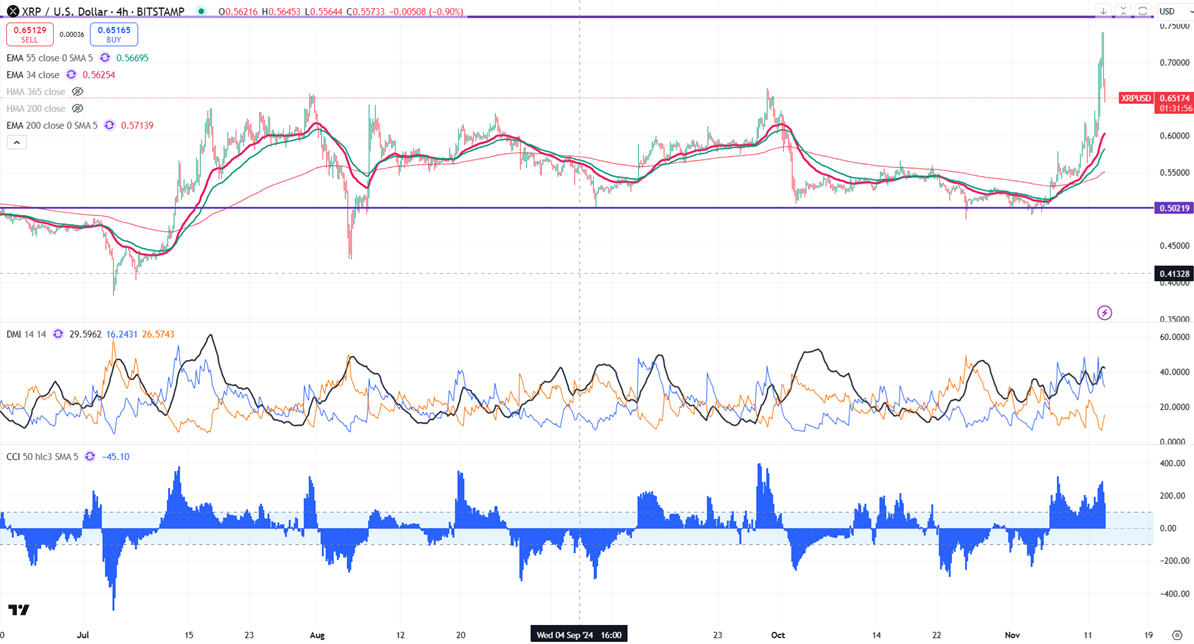 XRP/USD has risen significantly, gaining over 50% after the Trump victory. It has reached a peak of around 0.7400 but has seen some minor profit-taking, currently trading at around $0.6543.