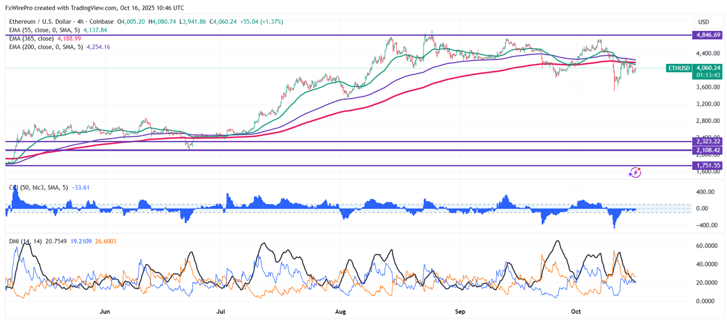ETHUSD is consolidating in a narrow range between $4276 and $3892 for the past three days. It hits an intraday high of $4080 and is currently trading around $4055.