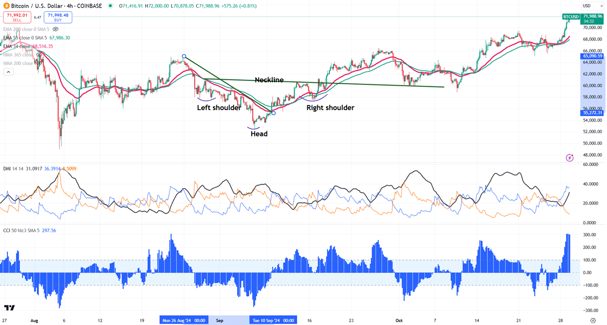 BTCUSD breaks $70000 on upbeat market sentiment. It hit a high of $72103 at the time of writing and is currently trading at around $68354.