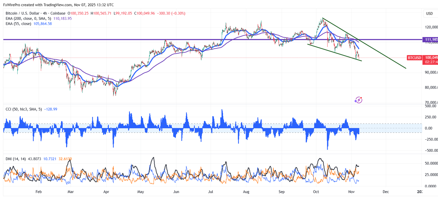 BTC/USD breaks psychological support $100000 on weak institutional demand. The pair hits an intraday low of $99622 and is currently trading around $99672.