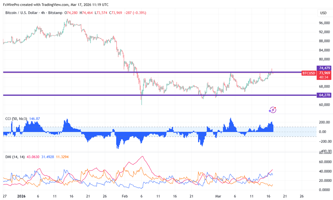 BTCUSD gained above $75000 as demand for risk appetite improves. Currently trading at about $73931, it has an intraday high of $76013.