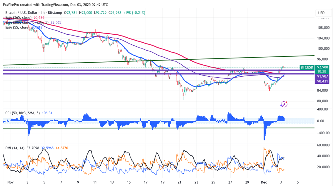 BTCUSD holds above $92000 due to an increase in institutional demand. It hits an intraday high of $93977 and is currently trading around $92925.