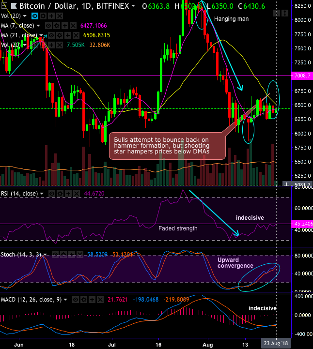 Today, although BTCUSD prices have attempted to bounce back from the lows of $6,350 levels to the recent highs of $6,502.6 levels, a sharp shooting star has occurred yesterday at $6,363.80 levels to signal bearish sentiment on the news of US SEC’s rejection of series of ETF proposals from three different companies.