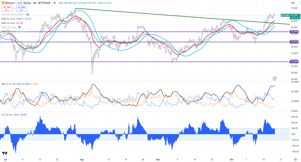 BTCUSD trades above the short-term moving average of 34- EMA and 55 EMA and the long-term moving average (200 EMA) in the 4-hour chart.