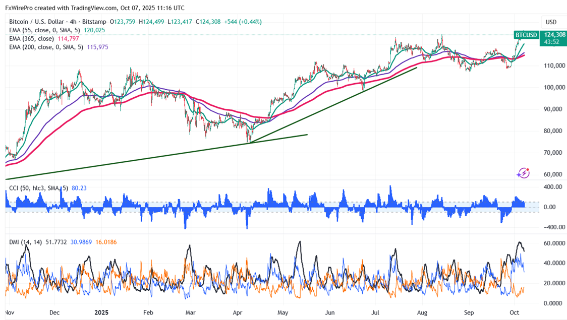 It trades above short-term (34-EMA and 55-EMA) and above long-term (200 and 365-EMA) moving averages on the 4-hour chart. Minor support is around $119000; breaking below this would drag the pair down to $117450/$115000/$112000/ $10720/$103000/$10000. Immediate resistance is around $126500 indicates that closing above this level could lead to targets $130,000, or even $135,000.