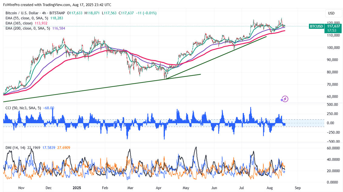 BTC/USD pared some of its gains due to profit booking after hitting an all-time high $124517. It trades below short-term (34-EMA and 55-EMA) and above long-term (200 and 365-EMA) moving averages on the 4-hour chart. Minor support is around $116500; breaking below this would drag the pair down to $113800/$111500/$108000/$103000/$10000. Immediate resistance is around $125000 indicates that closing above this level could lead to targets $125000/ $130,000, or even $135,000.