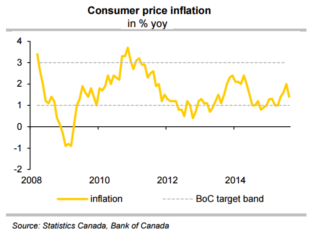 The Canadian economy has recovered notably from the oil price shock in late 2014, but the recovery has lost some momentum again towards the end of the year. The Bank of Canada (BoC) is attributing the slump in growth to temporary factors. The recovery of the Canadian economy is nonetheless likely to continue this year as oil price stabilises and US economy rebounds. At 1.4%, inflation is currently within the Bank of Canada's target band. Moreover, the risks for the inflation outlook remain balanced. Therefore, there is little need for the BoC to take action over inflation.