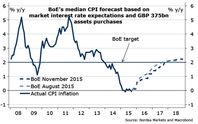 "Overall, today's BoE data deluge and unexpectedly dovish signals raise the risk of delayed BoE tightening compared to our call for a first rate hike in Q1 2016. The chance of a delay in lift-off in BoE rates until Q2 2016 is now higher", says Nordea Bank.