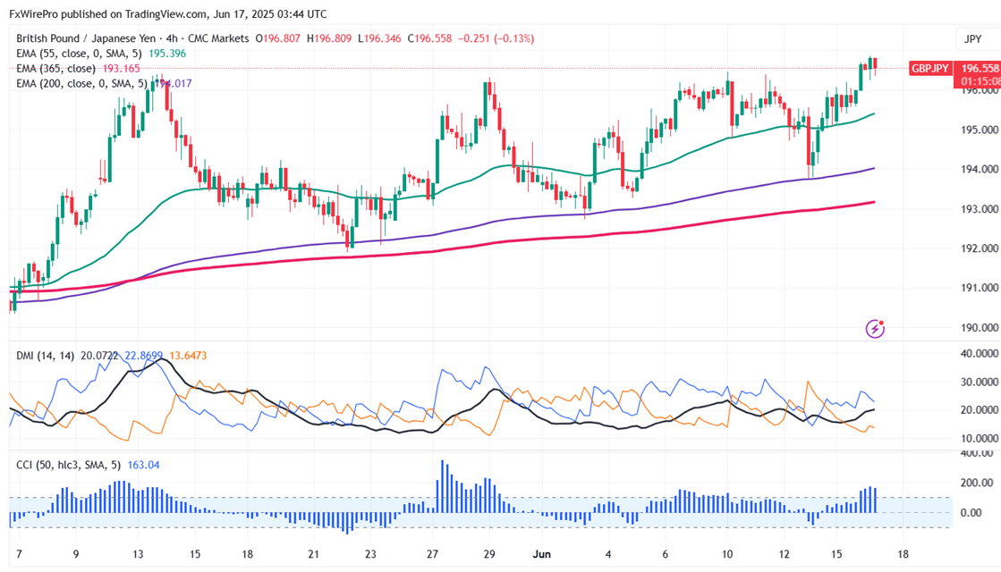 The GBP/JPY pair is trading above 34 and 55 and 200 EMA (Short-term) and 365 EMA (long-term) on the 4-hour chart, confirming a bullish trend. Any violation below 195.35 indicates the intraday trend is weak. A dip to 194.70/194.30/193.70 is possible. Immediate resistance is at 196.85, a breach above this level targets of 198/200. Any major uptrend is possible only above 196.50.