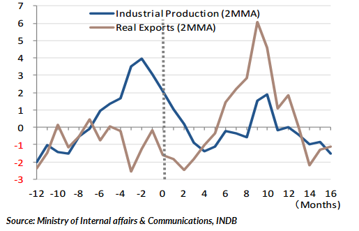 Japanese government has already revised down its overall assessment on production, explaining that "Industrial Production has weakened", as opposed to "Industrial Production fluctuates indecisively" in the previous assessment. This implies that production is now weakening as a trend. The production data for September (to be announced on 29 October) is likely to show further weakness.