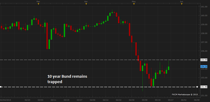 - German 10 year bund is trading in a range of 155 and 152, while yield remains trapped between 0.58% and 0.75%. Yields and bond prices move inversely.