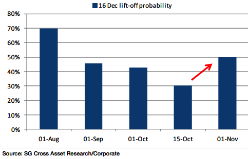 "In US, implied futures raised the probability of a first 25bp rate increase in December to 50% after a hawkish Fed FOMC statement on 28 October. The statement specifically referred to the next meeting where it will determine whether it is appropriate to raise rates, and removed the sentence referring to "recent global economic developments"", says Societe Generale.
