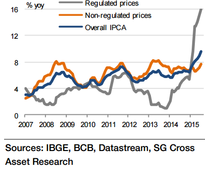 "Full-year inflation is forecasted at 9.0% followed by substantial, yet less than desirable, moderation in 2016 (6.5%) primarily due to the base effect. While theeffect of slow growth and the labour market deterioration could lead to a faster-than-expected slowdown in inflation next year, both the current trajectory and recent history give little confidence in this regard. Inflation will likely remain above the BCB's target over the forecast horizon", says Societe Generale.