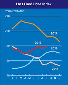 FAO Food Price Index for 2014-2017, showing prices creeping up through 2017. FAO