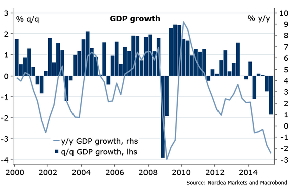 GDP contracted by -1.9% Q/Q in Q2, which was worse than expected. Low confidence, tighter monetary policy and worsened terms of trades are pulling the break on activity and investments. Both investments and imports contracted at their fastest pace since the financial crisis, with investments down by 8.1% Q/Q and imports down by 8.8% Q/Q, notes Nordea Bank.
