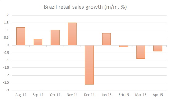 Gloomy news keeps on hitting Brazil. Latest data reveal, facing headwinds from higher inflation, lower value of Brazilian Real, higher interest rate is leading consumers to spend lesser.