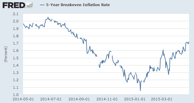 As of last week, 5 year breakeven inflation as measured from inflation protected treasury yields standing at 1.72% up from 1.05% in January and rising steadily. 5 year 5 year forward inflation expectation is close to 2.16%, close to its highest level this year.