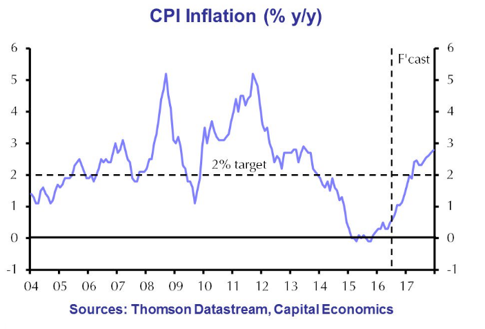Today’s inflation report is the first official government data that covers the period after the EU referendum. There was no obvious impact from Brexit on today’s consumer price data, but it’s probably too early to spot signs of Brexit damage. It will be some time before the full effect of the fall in sterling following the Brexit vote feeds into the headline inflation rate. A weaker pound will cause inflation to rise more sharply in the coming months.