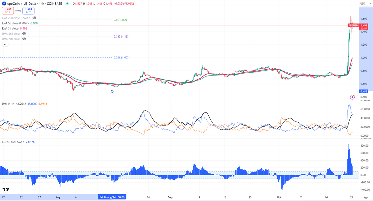 APEUSD has surged over 140% in the past three days, as the recent bridge launch positively impacted the trading pair. It currently stands well above both the short-term (34 and 55 EMA) and long-term moving averages, reaching a high of $1.732 and trading around $1.47.