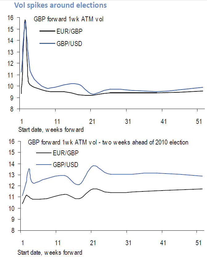 Here we can take you through a bird eye view on sterling's sentiments on currency options & forwards.The election premium is even clearer if we look at volume in forward rather than spot terms, as plotted in volume diagram: In both €/£ and £/$, one week volume, two weeks forward (i.e., covering the immediate wake of the election) spikes as high as 16%. Compared to previous elections, the "election premium" in the volume curve is huge.
