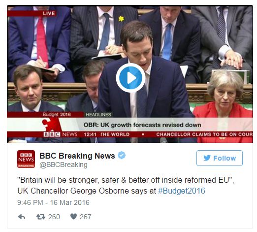 Twelve minutes into his “big statement” budget, Chancellor George Osborne made a strong plea for the British public to vote to remain in the European Union in the June referendum.