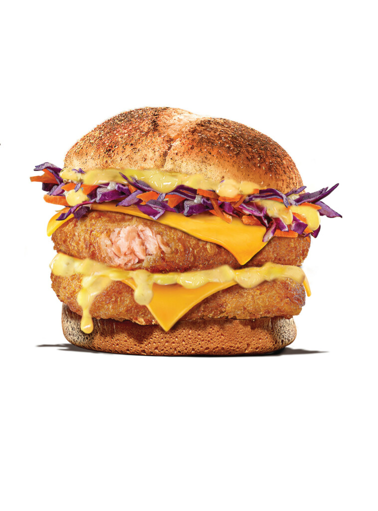 The first is the Double Ultimate Yuzu Salmon Burger, which consists of two juicy and crispy salmon patties, American cheese slices, and the Yuzu Mayo sauce in between a corn-dusted sourdough bun.