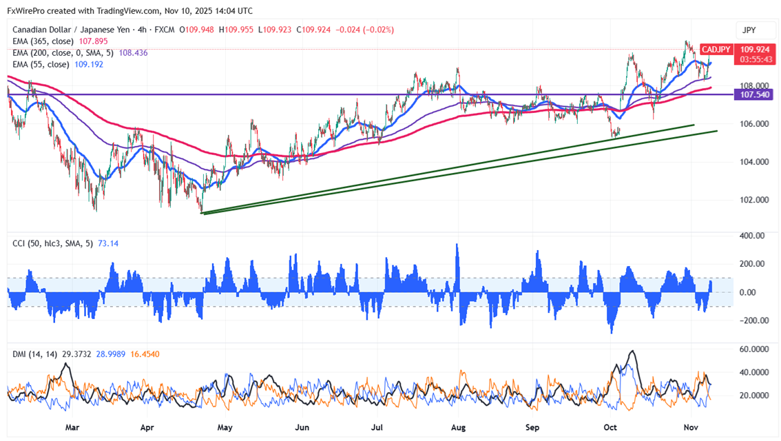 CAD/JPY gained above 109 on board-based Canadian dollar buying. It hits an intraday high of 110.07 and is currently trading around 109.94.